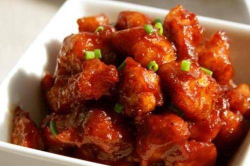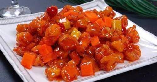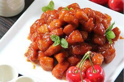 6:鍋內倒入少許的油,然後小火將番茄醬炒香,再倒入白醋、白糖、鹽、水、淀粉等,調好的調味汁用中火燒至濃稠,再倒入炸好的肉丁,炒勻即可出鍋裝盤食用。