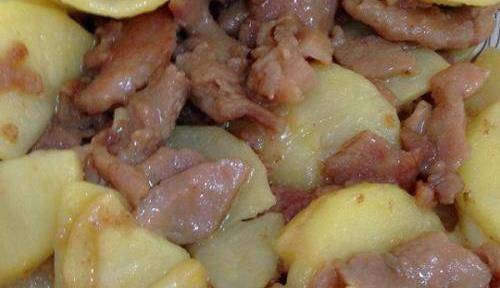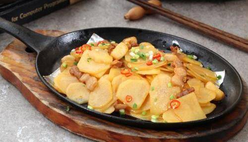 4:然後再放入土豆片,慢慢煎至表面起焦。