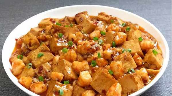 5、豆腐倒入鍋中,加入調味醬和少許水燒開,轉小火燉五分鐘,中途搖晃一下,防止粘鍋;然後加入蝦,煮一分鐘;最後加入少許鹽和雞精,加入淀粉水,大火收汁。