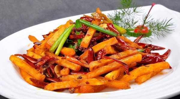 2.熱鍋燒熱油(平時用量的兩倍),放入薯條翻炒(這個過程需要中小火,耐心的把薯條的水炒出來)