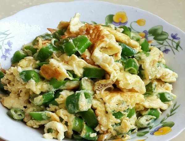 準備:1、青椒切小圈,蛋液加少許鹽、少許酒打勻;