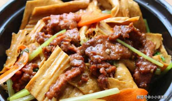 5、出香味後,將肉倒入鍋中,炒至變色,中間加少許水,然後放入切好的豆腐幹;