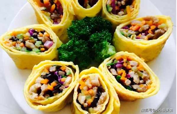 3、在煎蛋的一端放上粉絲、胡蘿卜絲和菠菜,慢慢卷起來,用斜刀切塊裝盤。中間放一個切好的糖雞蛋,放一個蘿卜花。