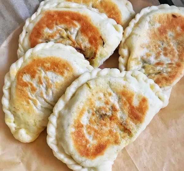 5.面團發到2倍大,取出面團到面案上,放少許面粉揉光滑,搓成長條然後切劑、搟成中間厚四周薄的厚面皮,放入胡蘿卜餡