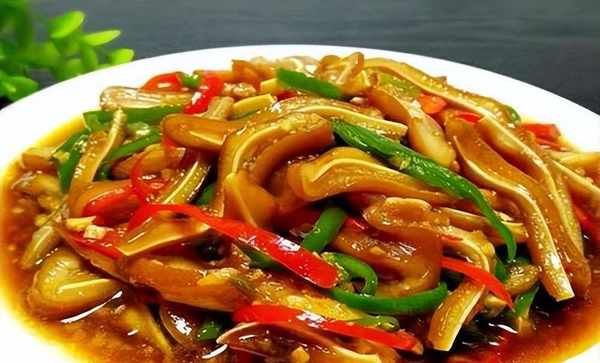 3.再次煮沸,用冷水沖洗,瀝幹備用。4、熱鍋冷油,油中加入鹽和肉片翻炒。5、用生抽將肉片炒至肉片入味均勻。