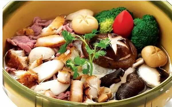 4.湯熬制三小時後,放入竹筍、百葉結、三層肉繼續熬制一小時,共四小時後便可食用瞭,最後調味加鹽、胡椒粉,最後放入青菜即可。