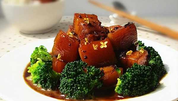 10、把西蘭花擺在盤子周圍,紅燒肉放在中間,撒上桂花即可。