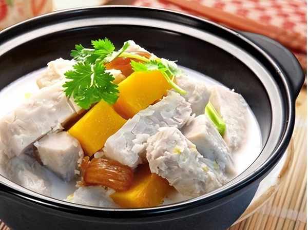 材料:南瓜半個,糯米100克,帶皮五花肉350克,蔥薑片20克,八角1個,花椒5-8粒,甜醬15克,香菜10克醬油、料酒5克。