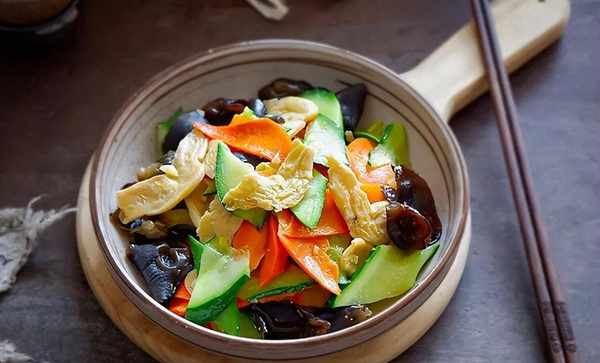 食材:大豆蛋白片50克,黑木耳5朵,胡蘿卜半根,黃瓜1根,食鹽2茶匙,胡椒粉1茶匙,蔬果調味粉1茶匙