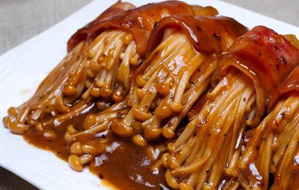 1.金針菇洗凈去頭,培根切成兩半。將金針菇和培根卷在一起,用牙簽固定。
