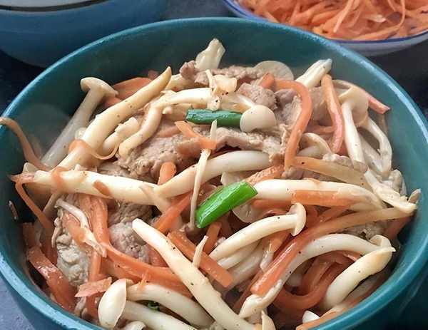 配料:白玉菇200克,豬肉100克,椒鹽2克,食用油1湯匙,生抽5克,鹽1克,雞精適量,胡蘿卜80克,還有一些蔥芽。