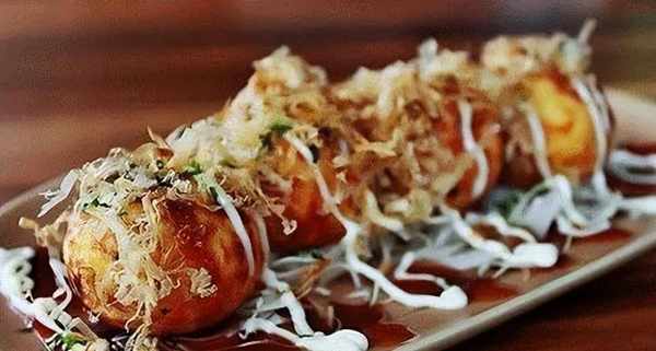 5.不斷轉動每個丸子,直到它變成金黃色。完成後,在上面塗上紅燒醬,然後在上面擠上沙拉醬,然後撒上海苔粉。