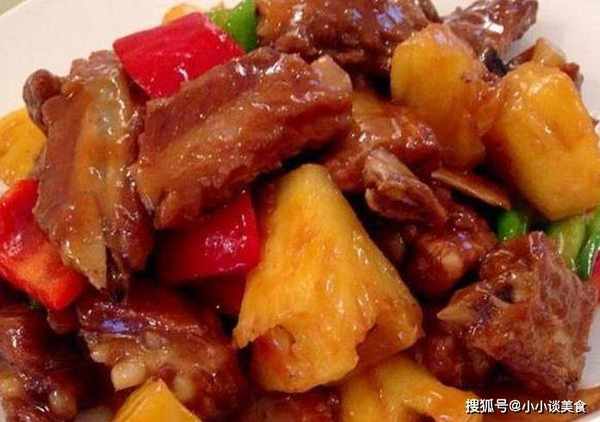 3、加入一勺料酒和一勺生抽繼續攪拌一分鐘;倒入開水沒過排骨,加入冰糖,轉中小火煮約1小時;等湯變濃稠時,用筷子挑出蔥、薑、蒜、八角、桂皮等調料;4、倒入之前準備好的番茄醬;再次勾芡湯;倒入鳳梨、青椒、紅椒;果汁中沒有糖。如果沒有冰糖,可以在番茄醬中加入一兩茶匙的糖來調節甜度和酸度。