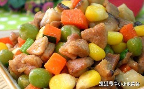 6、然後加入炸好的雞塊、豌豆粒和玉米粒拌勻;