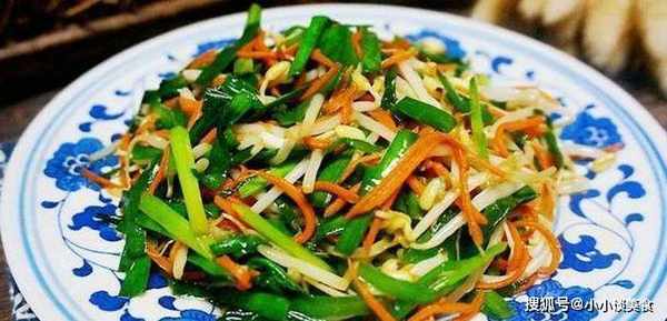 材料:韭菜1根、綠豆芽300克、胡蘿卜半根、鹽1克、生抽2湯匙、醋1匙、蔥、薑適量
