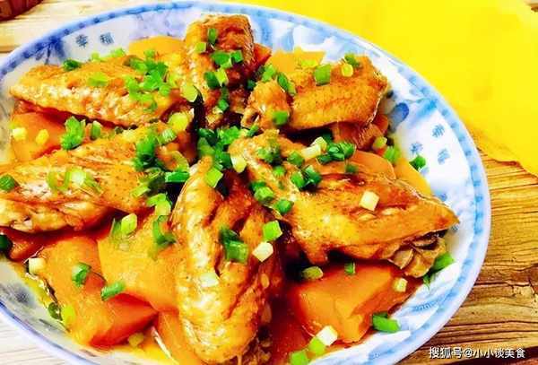 材料:老南瓜、雞翅、黃酒1勺、生抽1勺、老抽1勺、蠔油2勺、鹽少許、蔥花少許