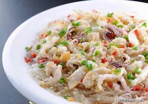 材料:鮮魷魚200克、水發粉絲200克 蠔油、蒸魚醬油、蒜頭5粒、紅辣椒末、蔥花、鹽、雞精、味精、色拉油