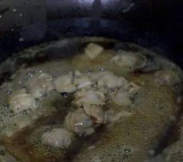 7、往鍋中倒入蛤蜊汁,燒開加少許鹽、白糖,再加入1勺蠔油調味。