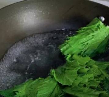 6、然後往鍋中再放水燒開,加入少許鹽,放入芥菜過水,裝盤。