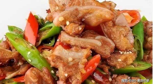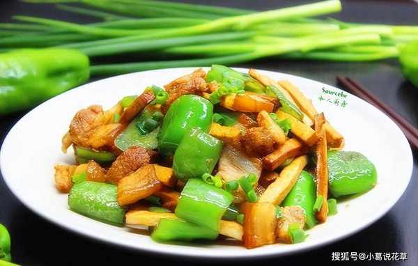 3、肉煎好後,鍋內留油,炒至香幹。半熟起鍋;鍋裡放油,加入青辣椒炒熟;
