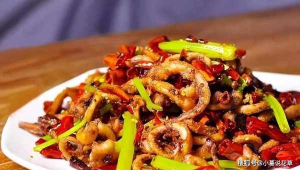 3、鍋中倒入沸騰的植物油,燒熱。加入豆瓣醬炒香,再加入幹辣椒和刺灰炒香,再加入青辣椒、小紅蔥和茶樹、香菇一起炒,加入鮮魷魚條和鹽,拌勻。上桌前加入醬油、味精和雞精。