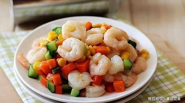 原料蝦仁350克;30克黃瓜;30克胡蘿卜;30克玉米粒;1湯匙油;1茶匙鹽;1茶匙白葡萄酒;2茶匙淀粉