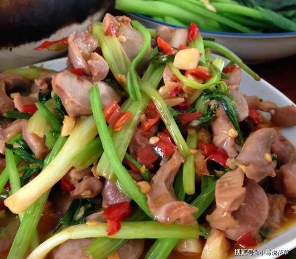 2、鍋內燒熱色拉油,將醃制好的雞內臟炒勻,加入豆瓣醬、蒜瓣、鹽椒、鹽椒粉炒香,芹菜加入部分、味精、雞精、起鍋酒和辣椒煮熟後,用濕生粉勾芡,淋少許醋即可食用。