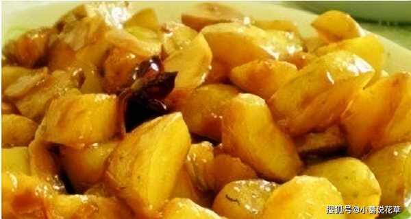 3、另取一鍋,加少量油,放入薑、蔥、蒜、甘草,炒香,再放入炸好的土豆,稍炒一會,放醬油,加糖、鹽,拌勻,放入一個大碗把水燒開,用中火加熱至湯變濃稠,加入水和淀粉即可食用。