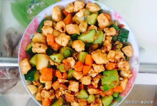 3.鍋中放油,放入調好的調料汁翻炒,放入豆瓣醬炒紅,加入胡蘿卜和炒過的雞肉炒勻,最後放入蔥和黃瓜,翻炒均勻即可。