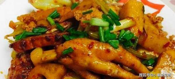 2、辣椒切管,大蔥切長條,蒜切片,薑切絲,小米椒切半……土豆切片,炸至中熟,備用。熱鍋燒熱油,油80%熱時,放入花椒粒,加入雞爪一起炒。