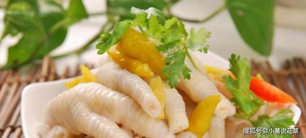 2、雞爪洗凈去甲,切開,先一分為二,再用手指把邊一分為二。整個泡沫難吃。燉爛,薑絲,泡椒,鹽,糖,醋,拌勻,鹽一茶匙,糖兩茶匙,醋一湯匙。