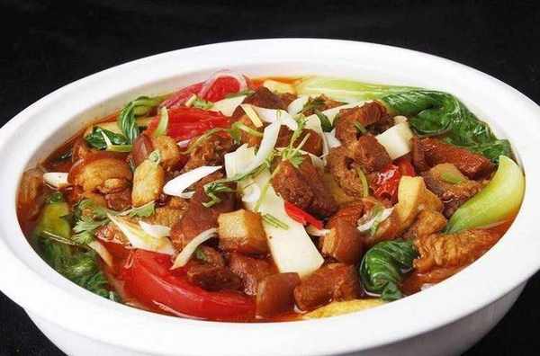原料:上等牛排或熟豬肉、生菜、香菇、蔥薑、豆腐、胡蘿卜、粉條、鹽、八角、桂皮、胡椒粉、醬油、白糖