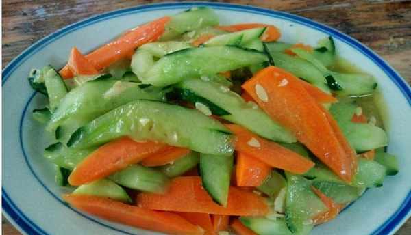 原料:黃瓜、胡蘿卜、油、鹽、蒜、雞精。方法步驟;1、準備好食材,先將黃瓜洗凈,用斜刀切成片。