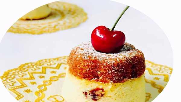 13.篩入少許糖粉,加入一顆紅心櫻桃。