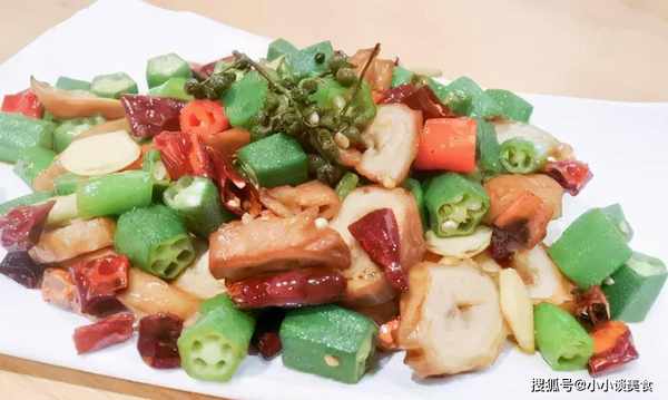2、熱鍋冷油,將蒜、蔥、薑炒香,加入肥腸、青椒、秋葵用大火快速炒熟,撒上胡椒粉、黑胡椒粉少許。醬油調味。