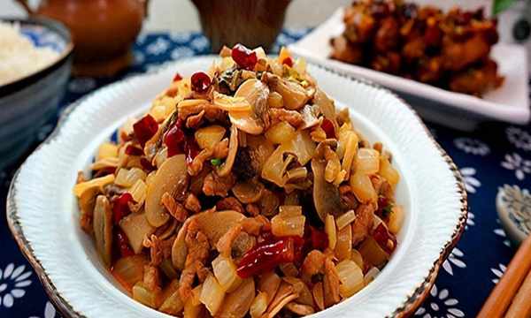 3、鍋內放少許油,加入薑、蒜、蔥花和幹辣椒炒香,再放入醃制好的豬肉,一起炒,開大火,放入瀝幹的白蘑菇炒香。大約三四分鐘後,加入一些豆沙