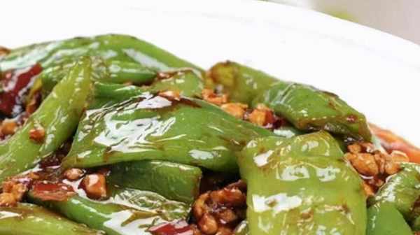 4.將青椒放在鍋的一側,加入蒜末炒香,倒入步驟(2)的辣醬,攪拌調味,待湯汁濃稠後裝盤。