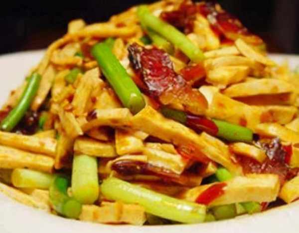 6、加入五香豆腐幹翻炒片刻,再將豆腐幹炒出香味。
