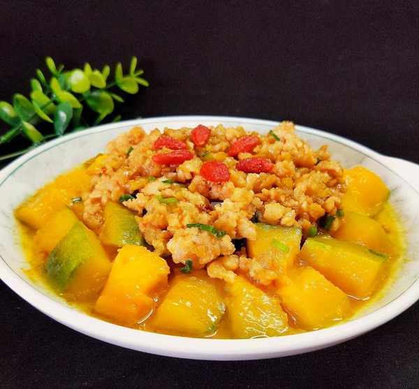 材料:南瓜300g,五花肉90g,輔料,蒜幾片,蔥花少許,枸杞少許,鹽少許,醬油,淀粉少許