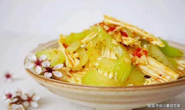 2.鍋中水燒開,加入豆腐塊,放入冷水中焯水不超過1分鐘。芹菜也焯水後用冷水浸泡。將兩種材料放在盤子裡,加少許鹽和生抽。