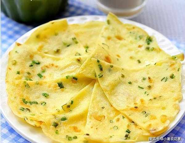 4)鍋裡倒油,然後倒入兩大勺面團,小心攤開,切成薄片,不要太薄。