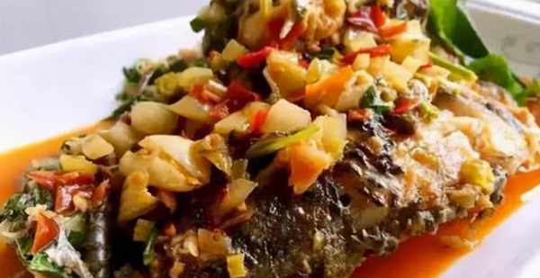 2、鍋中植物油燒熱,加入薑蒜、泡椒末、花椒末、泡菜末、豇豆末、小米椒爆香,加入適量鮮湯,加鹽、糖調味。味精,醬汁稍勾芡,澆在魚身上,撒上蔥花、香菜和小米椒節。