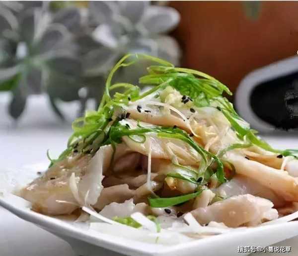 5、在煮熟的魚片上撒上胡蘿卜末、薑末和香菜末,加入胡椒油、鹽、白酒和味精拌勻。
