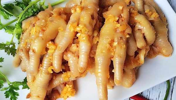 3、5分鐘後,鳳爪熟瞭,皮上有一朵小花。用冷開水泡兩次,吸出粘稠的液體,去掉中間的主骨,在蒜蓉裡倒入一小勺熱油,把蒜蓉稍微煮一下,把鳳爪放在盆裡,加少許鹽和雞精,一勺辣椒油,拌入蒜油,拌勻裝盤