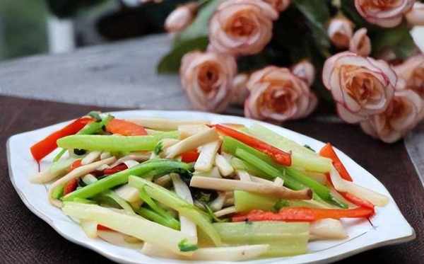 4.然後倒入芹菜和杏鮑菇炒均勻,直到胡蘿卜和杏鮑菇變軟。