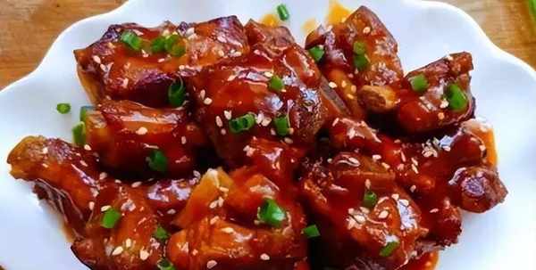 材料:排骨、薑片、蔥花、料酒、色拉油、老抽、生抽、白砂糖、白芝麻