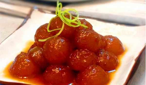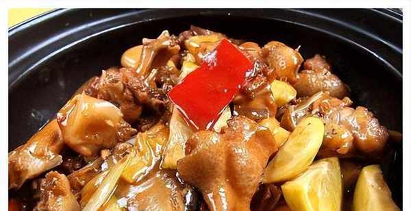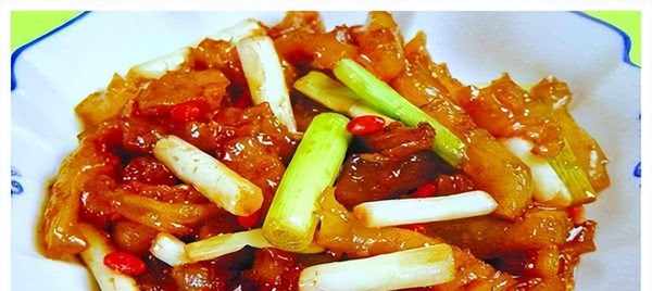 2、肥豬蹄筋去除油脂和雜質,用清水洗凈,切成小塊,放入開水鍋中焯一下,撈出瀝幹水分。3.鍋內加入熟豬油,開火至80%,加入白糖小火煮至紅色,加入牛筋翻炒上色,加入清湯,開大火,轉小火燜煮入味。