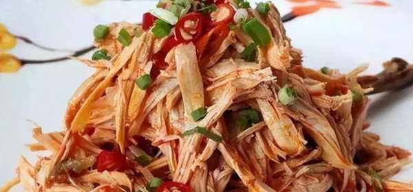 3、冷卻後的雞肉用手撕成小條,加入香菇,倒入醬汁拌勻。將另一半檸檬磨碎,混入碗中,最後撒上一些香菜。