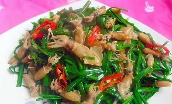 小魷魚、韭菜、紅辣椒、薑、花椒、花生油、鹽、胡椒粉、料酒、醬油、味精。