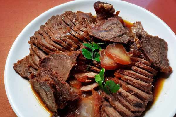 醃制過後,裡面加入八角,香葉,草果,山楂,陳皮,花椒,蓋上蓋子大火煮開,再撇去浮末,然後轉中火,加入豆腐乳,黃豆醬,冰糖,繼續煮2個小時,關鍵這步不要蓋蓋子,敞開著煮,2小時候用筷子戳牛肉,直接能插進去就關火,不要撈出來,繼續浸泡8個小時,8個小時後取出牛肉切塊裝盤,淋上煮牛肉的湯汁,美味既成。這樣做牛肉醬香味濃鬱,色澤紅亮,有食欲,比鹵菜店的都好吃。